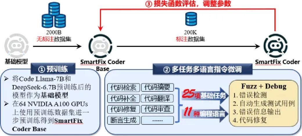 随着深度学习技术的进步,大语言模型(LLMs)在代码生成方面展示出巨大优势,标志着软件开发进入新纪元。然而,LLMs在代码错误检测和自动修复领域的应用尚浅。我们提出SmartFix Coder模型,通过智能理解代码逻辑,实现代码生成、审计和自动修复。SmartFix Coder利用大模型的模糊测试和多任务多语言学习框架,能检查代码错误,识别安全漏洞,并生成修复的代码和单元测试。SmartFix Coder在代码生成、漏洞检测和修复方面较现有模型表现突出,创新点包括结合预训练模型与模糊测试技术,构建覆盖多任务多语言的数据集,设计易用的前端平台,使开发者更高效地进行代码审计和修复工作。