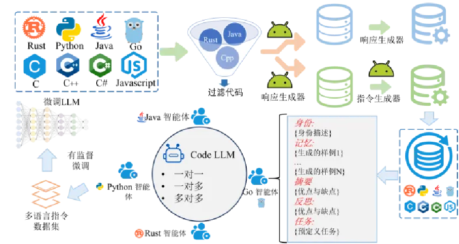 为了弥合不同代码语言之间的编程差异,本作品创新设计了一种多智能体协作框架,以增强Code LLM的多语言指令调优效果。该框架实现了多个具有生成记忆的特定语言智能体组件的协同工作,高效地将知识从一种语言传输到另一种语言。这些智能体致力于达成共同的任务,并通过信息共享来优化集体解决方案。此外,为了提升Code LLM的跨语言适应性,本作品基于开源数据构建了一个名为X-INSTRUCT的多语言指令数据集。本作品基于生成的数据集分别对Code Llama和Deepseek-Coder进行监督微调,进而生成Code LLM模型——xCoder,通过对xCoder进行测试,验证所提框架在代码理解与生成方面的有效性。