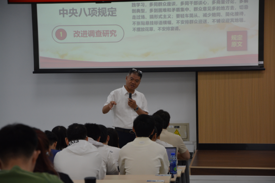 在会议的第一项议程中,公司经理罗洪斌同志为全体党员讲授了八项规定专题党课。本次党课以“深入学习中央八项规定精神”为主题,从多个维度进行了深刻解读。罗洪斌同志详细讲解了中央八项规定的主要内容,包括改进调查研究、精简会议活动、精简文件简报、规范出访活动、改进警卫工作、改进新闻报道、严格文稿发表和厉行勤俭节约等八个方面。他指出,中央八项规定精神是全党同志的共同要求,体现了以上率下的精神,是符合中央八项规定内涵的一系列政策规定的统称,每一名党员都应当严格遵守。罗经理还通过一系列详实的数据,进一步深入解读了八项规定的重要意义和实践价值,强调中央八项规定是新时代共产党人的一张“金色名片”。全体党员在党课学习中认真聆听、积极思考,纷纷表示要将中央八项规定精神内化于心、外化于行,以实际行动践行党的优良作风。