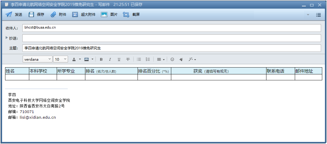 具体办法:4-10项材料制成电子扫描版,与2、3项电子版材料一起压缩,以附件形式发送邮箱:bhcst@buaa.edu.cn;第1项“报名表”填写好后直接“粘贴”到邮件内容页上,邮件主题命名为“×××申请北航2019推免研究生”。如图: