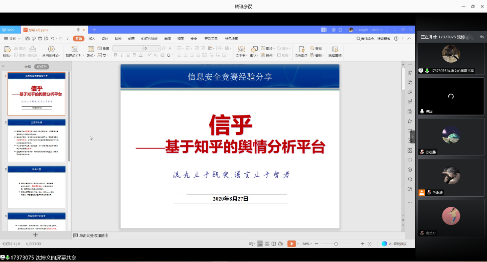 接着,来自2020年第十三届全国老员工信息安全竞赛二等奖组的沈博文同学,以他们团队的作品“信乎”为例,为我们带来了细节化的经验分享。他从立题与创意、准备比赛过程、答辩技巧几方面介绍了参赛过程中的注意事项。