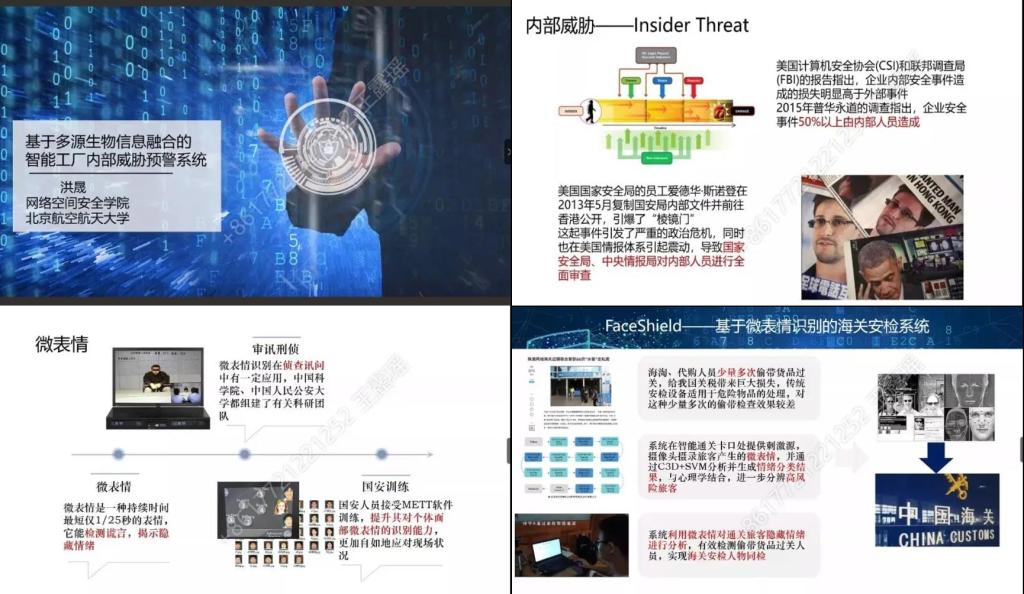 洪晟老师对于何为内部威胁做出解释,并展示了内部安全对于企业的重要性。洪晟老师课题的主要内容是通过摄像头传感器等获取人的微表情、面部颜色、眼动等多元生物信息,利用算法判断内部人员当前状态是否可能产生安全威胁,并向企业发出预警,减少内部威胁。展示了该项目的理论与技术层面的研究过程,以及国内外相关方向学者的研究内容,让同学们受益匪浅。洪晟老师另外还向同学们介绍了由他亲自带队,几位同学完成并获得信息安全作品赛一等奖的课题:FaceShield——基于微表情识别的海关安检系统,并通过一个视频生动的展示了他们研究成果。听完洪老师的精彩讲座,同学们受益匪浅,尤其是对于在网安公司学习的同学们,了解更多网安方向的前沿学术知识对于自己当前的学习与未来的研究都会有很大的帮助。